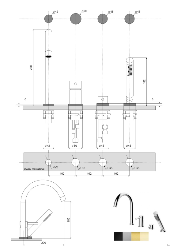 - Příslušenství: ruční sprcha, sprchová hadice, sprchový držák, přepínač proudu, kohoutek a baterie
