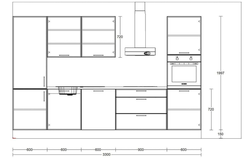 NĚMECKÁ KVALITA. Plně vybavená kuchyňská linka délky 330 cm, nyní za akční cenu. Obsahuje veškeré skříňky (v barvě alpská bílá), kování, černé úchytky, sokl, pracovní desku v barvě strukturovaná černá, nerezový dřez s odkapem a dokonce i veškeré vestavné spotřebiče: troubu, sklokeramickou desku, černý komínový odsavač par, chladničku a myčku nádobí. Jednoduchá montáž - všechny skříňky dodáváme již smontované. Součástí dodávky není dřezová baterii.