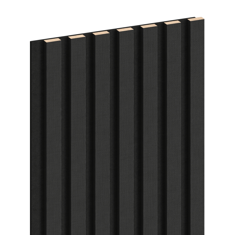Specifikace produktu: Délka: 275 cm Šířka: 31,5 cm Tloušťka: 1,9 cm Tloušťka podstavce: 6 mm Tloušťka jedné lamely: 13 mm Šířka jedné lamely: 28 mm Rozteč mezi lamelami: 18 mm Počet lamel: 7 Materiál lamel: MDF páska + melaminová dýha Podkladový materiál: Plsť Struktura lamel: Len Odstín lamel: Černá Barva podkladové vrstvy: Černá Způsob montáže: Lepením nebo šrouby Obsahuje materiály zpomalující hoření Mají akustické a zvukově izolační vlastnosti, které účinně snižují nežádoucí zvuky