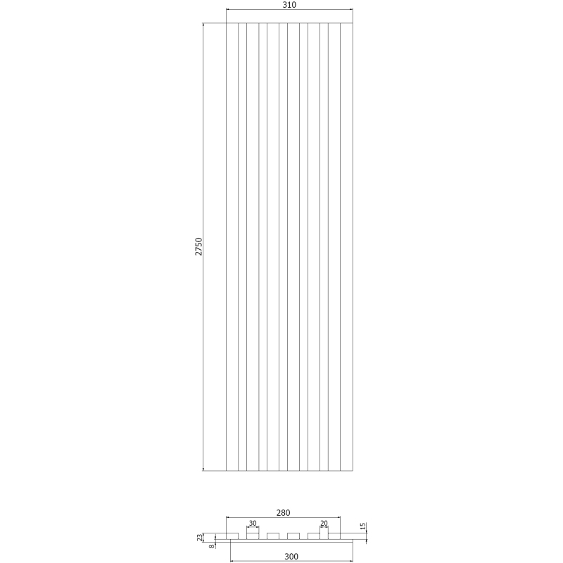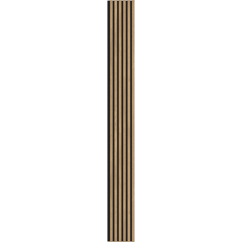 Specifikace produktu: Délka: 275 cm Šířka: 30 cm Tloušťka: 2,3 cm Tloušťka podstavce: 8 mm Tloušťka jedné lamely: 15 mm Šířka jedné lamely: 30 mm Rozteč mezi lamelami: 20 mm Počet lamel: 6 Materiál lamel: MDF páska + technická dýha Podkladový materiál: Plsť Konstrukce lamel: Borovice Odstín lamel: Přírodní Barva podkladu: Černá Způsob montáže: Lepením nebo šrouby Obsahuje materiály zpomalující hoření Mají akustické a zvukově izolační vlastnosti, které účinně snižují nežádoucí zvuky
