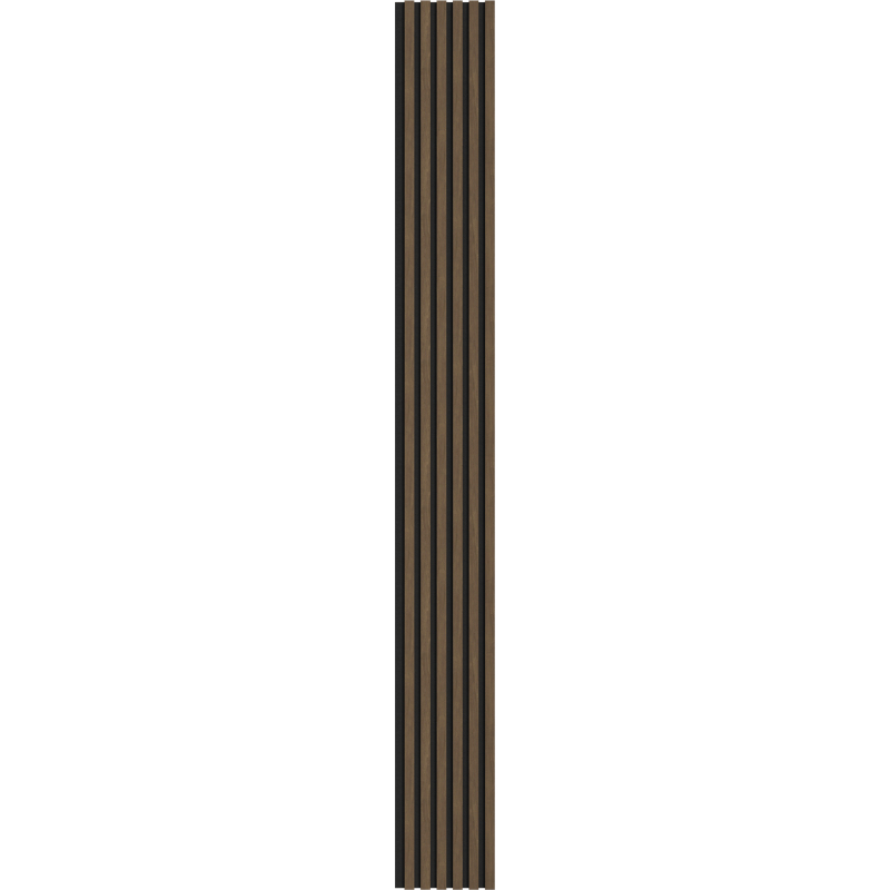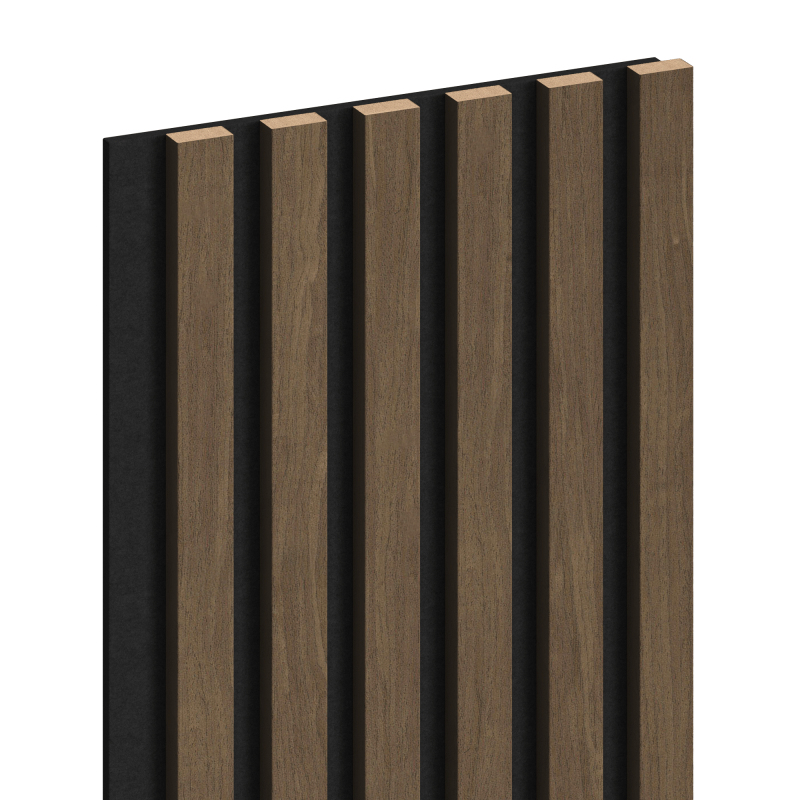 Specifikace produktu: Délka: 275 cm Šířka: 30 cm Tloušťka: 2,3 cm Tloušťka podstavce: 8 mm Tloušťka jedné lamely: 15 mm Šířka jedné lamely: 30 mm Rozteč mezi lamelami: 20 mm Počet lamel: 6 Materiál lamel: MDF páska + technická dýha Podkladový materiál: Plsť Konstrukce lamel: Ořech Odstín lamel: Hnědá Barva podkladové vrstvy: Černá Způsob montáže: Lepením nebo šrouby Obsahuje materiály zpomalující hoření Mají akustické a zvukově izolační vlastnosti, které účinně snižují nežádoucí zvuky