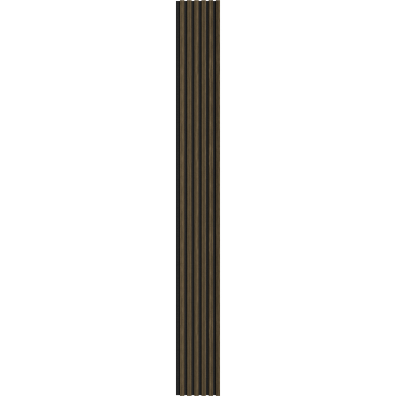 Specifikace produktu: Délka: 275 cm Šířka: 30 cm Tloušťka: 2,3 cm Tloušťka podstavce: 8 mm Tloušťka jedné lamely: 15 mm Šířka jedné lamely: 30 mm Rozteč mezi lamelami: 20 mm Počet lamel: 6 Materiál lamel: MDF páska + technická dýha Podkladový materiál: Plsť Konstrukce lamel: Ebenová barva Odstín lamel: Hnědá Barva podkladové vrstvy: Černá Způsob montáže: Lepením nebo šrouby Obsahuje materiály zpomalující hoření Mají akustické a zvukově izolační vlastnosti, které účinně snižují nežádoucí zvuky