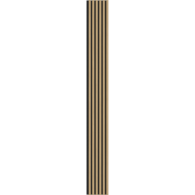 Specifikace produktu: Délka: 275 cm Šířka: 30 cm Tloušťka: 2,3 cm Tloušťka podstavce: 8 mm Tloušťka jedné lamely: 15 mm Šířka jedné lamely: 30 mm Rozteč mezi lamelami: 20 mm Počet lamel: 6 Materiál lamel: MDF páska + technická dýha Podkladový materiál: Plsť Konstrukce lamel: Dub Odstín lamel: Přírodní Barva podkladové vrstvy: Černá Způsob montáže: Lepením nebo šrouby Obsahuje materiály zpomalující hoření Mají akustické a zvukově izolační vlastnosti, které účinně snižují nežádoucí zvuky