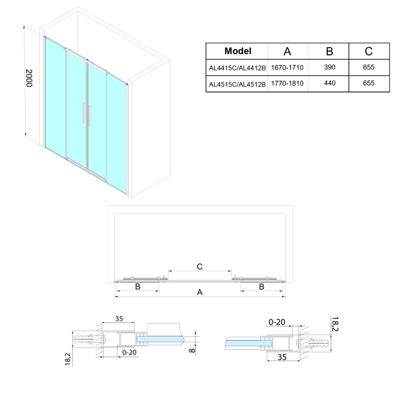 ALTIS BLACK posuvné dveře 1770-1810mm, výška 2000mm, čiré sklo