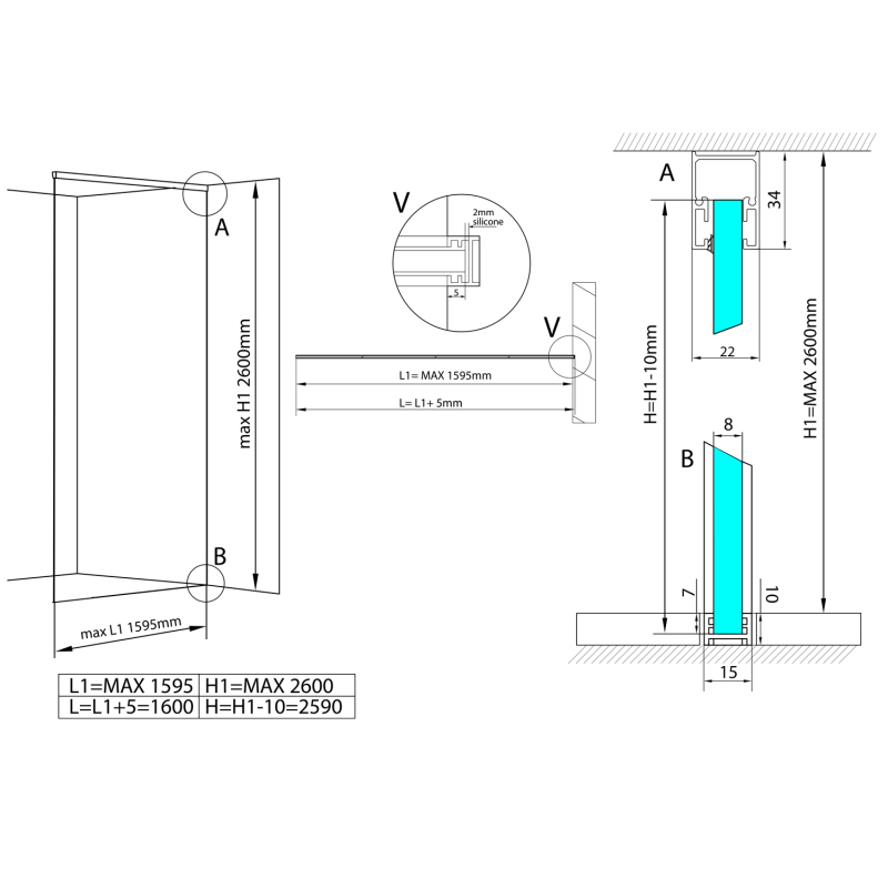 ARCHITEX sada pro uchycení skla, podlaha-stěna-strop, max. š. 1600mm, černá mat AXL2816B