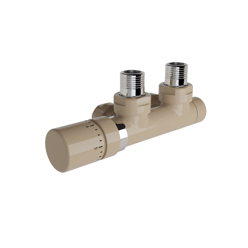 Armatura Zehnder rohová 1/2", s termostatickou hlavicí Design Line vlevo, Set Q, RAL 0523 beige quartz, Z-839429-0523