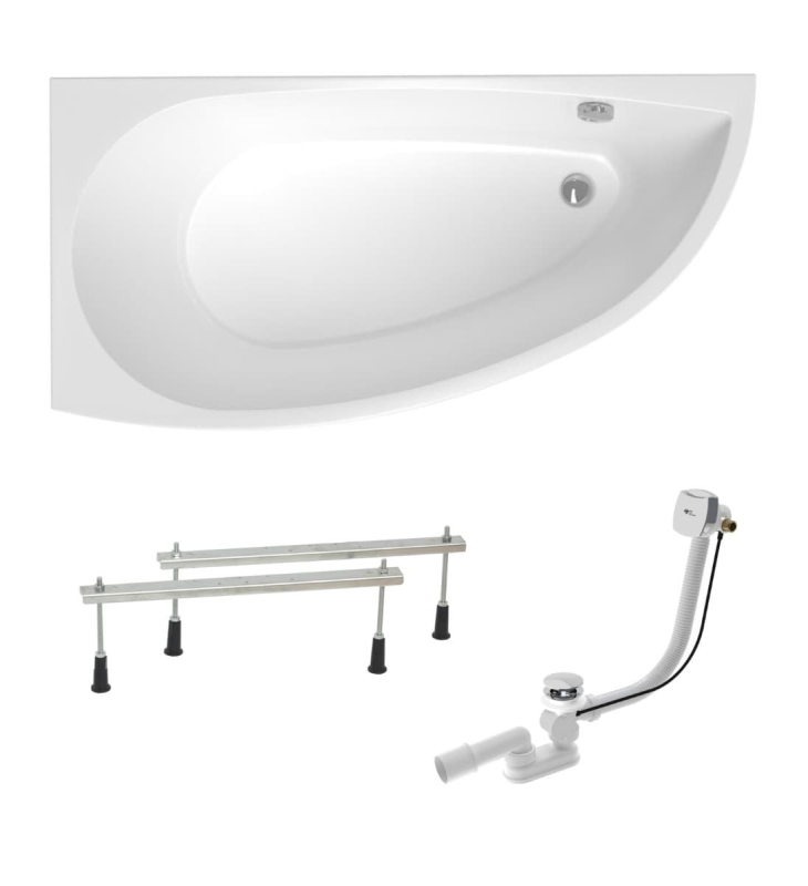 Asymetrická vana vyrobená z akrylátu, tloušťka materiálu je 5 mm. Určení vany - levá orientace. Objem vany je 180 litrů. Včetně sifonu s napouštěním přepadem a nožiček.