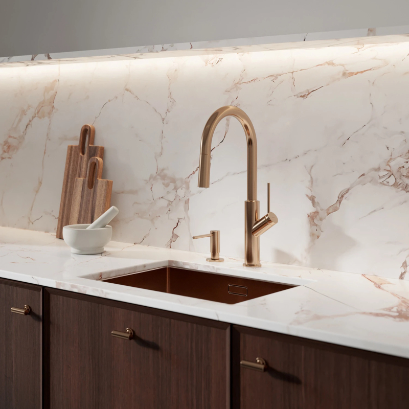 Broušená měď má ušlechtilý povrch s teplou červenohnědou barvou a saténovým povrchem. Povlak byl vyroben pomocí pokročilé technologie PVD.