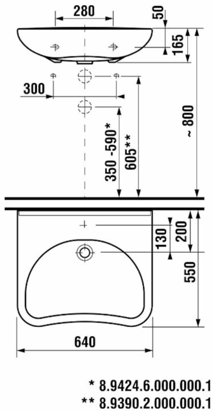 Bezbariérové umyvadlo s otvorem pro baterii uprostřed o šířce 64 cm, hloubce 55 cm a výšce 16,5 cm. Povrch se snadnou údržbou. Balení bez sifonu a baterie. Montážní sadu je nutné dokoupit.