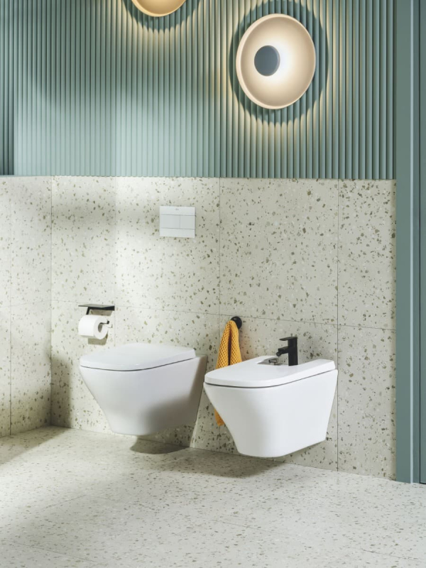 Závěsný bidet se zadním odpadem. Balení je bez prkénka.