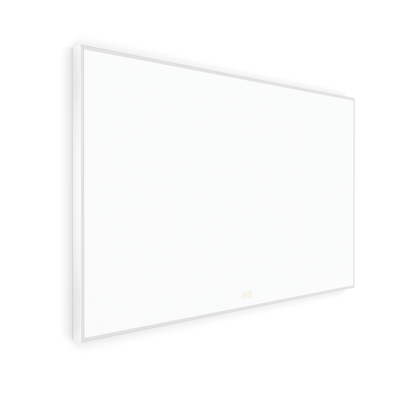 Obdélníkové zrcadlo s rámem s ostrými rohy a celoobvodovým svícením pro dokonalé a rovnoměrné osvětlení.
