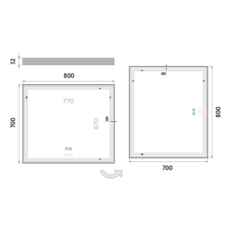 Bílé LED zrcadlo 800x700 se dvěma dotykovými senzory