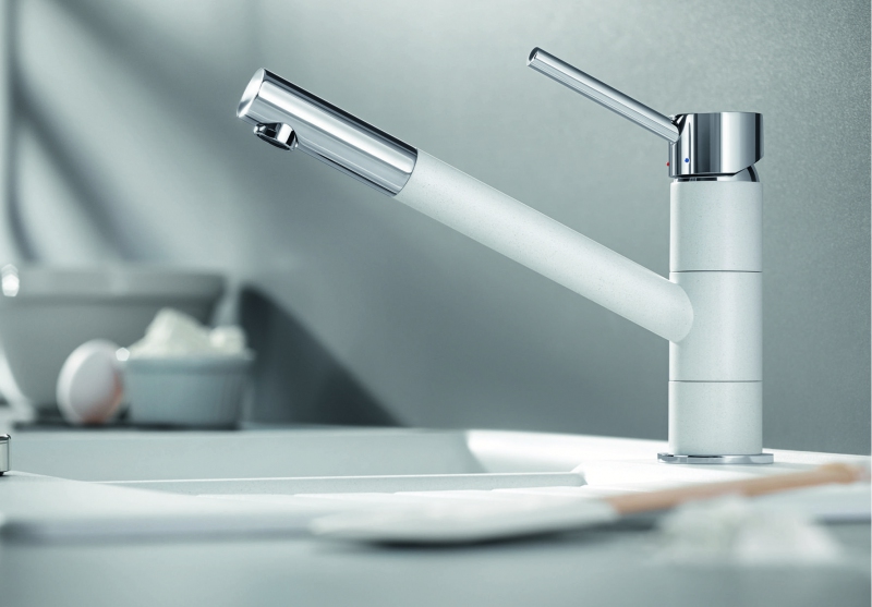 Kombinace silgranit/chrom povrch • Štíhlá baterie s estetickým designem • Obzvláště určeno pro kompaktní dřezy • Rozšířený akční rádius díky otočnému raménku 360°