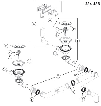 odtoková a přepadová armatura s prostorově úspornou trubkou, spojky odpadu, 2 x