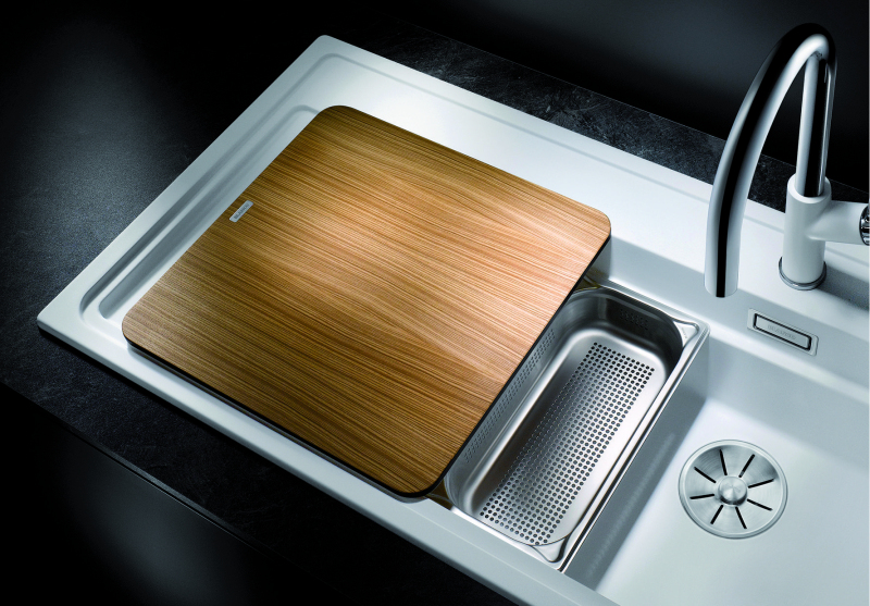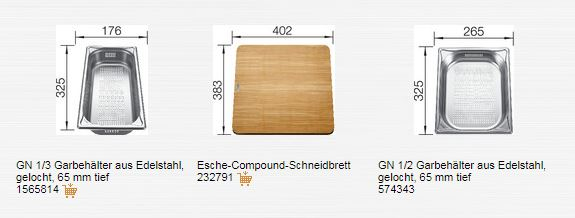 Krájecí dřevěná deska 232791, GN 1/3 děrovaná nerezová gastronádoba 1565814, GN 1/2 děrovaná nerezová gastronádoba 574343, odtoková armatura s prostorově úspornou trubkou, 3 1/2‘ InFino ventil, excentrické ovládání výpusti