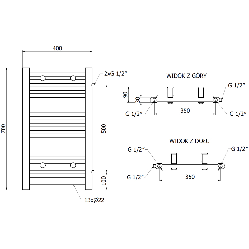 Technické údaje: Výška: 700 mm Šířka: 400 mm Hloubka: 30 mm Rozteč připojení: - 50 cm (bočně) nebo 35 cm (dole) Barva: Bílá RAL 9016 Materiál: Ocel Hmotnost: 4,42 kg Reakce na oheň: A1 Provozní teplota: max. 95 °C Maximální provozní tlak: 0,6 MPa Topný výkon: - 75/65/20 °C - 238 W Připojení: - 2xG ½″ bočně na pravé straně - 4xG ½″ shora a zdola na pravé nebo levé straně Možnost instalace topného tělesa Vysoce kvalitní, odolný, korozivzdorný nátěr Sada obsahuje: zavěšení, montážní sadu, záslepky a odvzdušňovací otvor