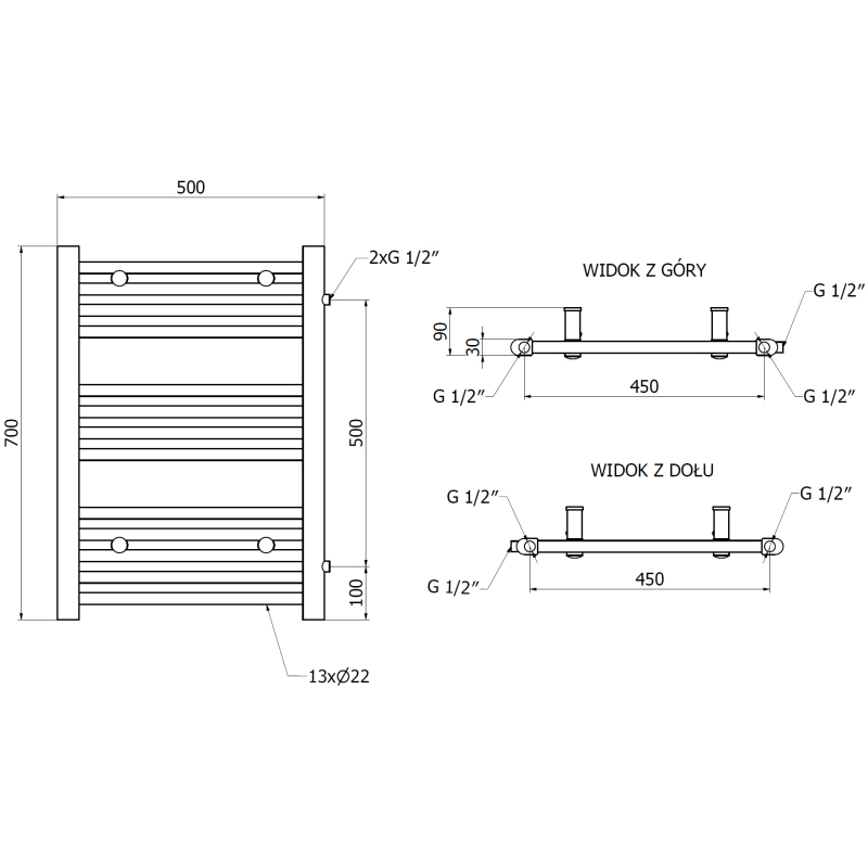 Technické údaje: Výška: 700 mm Šířka: 500 mm Hloubka: 30 mm Rozteč připojení: - 50 cm (bočně) nebo 45 cm (dole) Barva: Bílá RAL 9016 Materiál: Ocel Hmotnost: 5,07 kg Reakce na oheň: A1 Provozní teplota: max. 95 °C Maximální provozní tlak: 0,6 MPa Topný výkon: - 75/65/20 °C - 238 W Připojení: - 2xG ½″ bočně na pravé straně - 4xG ½″ shora a zdola na pravé nebo levé straně Možnost instalace topení Vysoce kvalitní, odolný, korozivzdorný nátěr Sada obsahuje: zavěšení, montážní sadu, záslepky a odvzdušňovací otvor