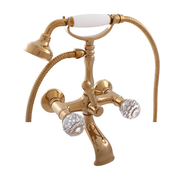 Vodovodní baterie vanová nástěnná s vidlicí na odkládání sprchy a sprchou.