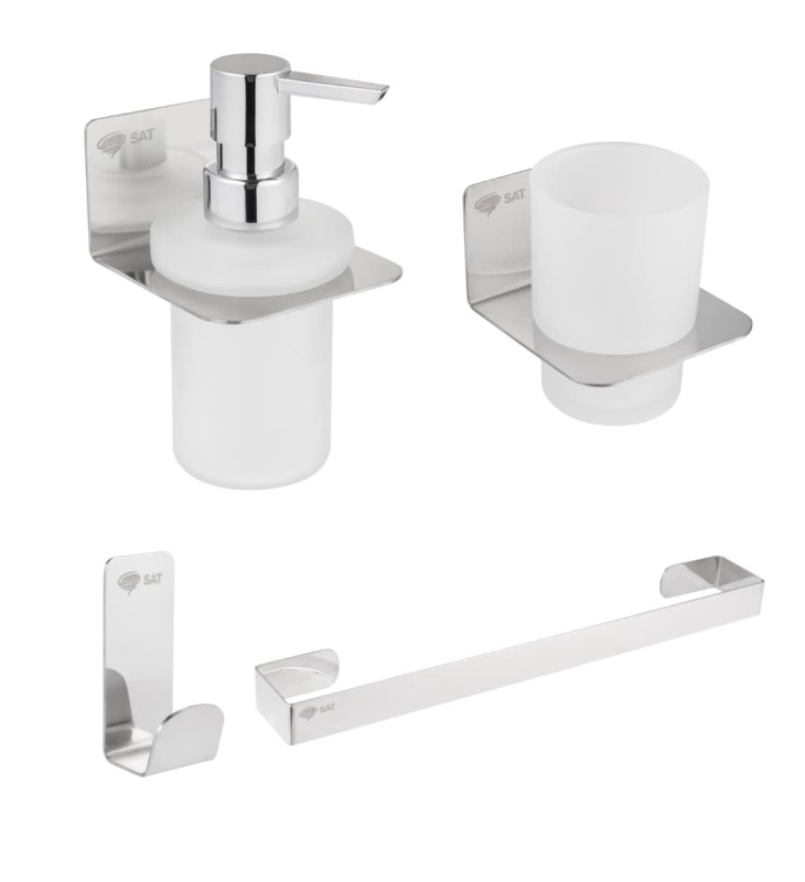 Praktický set koupelnových doplňků SAT, který se skládá z háčku (SATDBMOOD2CH), dávkovače mýdla (SATDMOOD99CH), držáku skleniček (SATDMOOD27CH), držáku ručníků (SATDMOOD23CH)