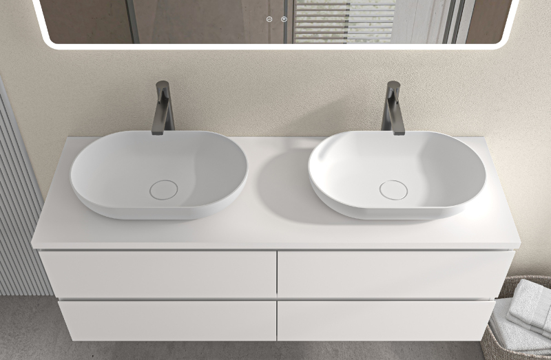 Koupelnové desky jsou vyrobeny z MDF lamina (středně hustá dřevovláknitá deska) s nalisovanou melaminovou fólií, která je odolná vůči vlhkosti, poškrábání, UV záření a běžným čisticím prostředkům. Povrch je hladký, tvrdý, homogenní a snadno se čistí. MDF desky se nekroutí jako masivní dřevo. Pokud dojde k mechanickému narušení laminace, samotné MDF jádro může navlhnout.