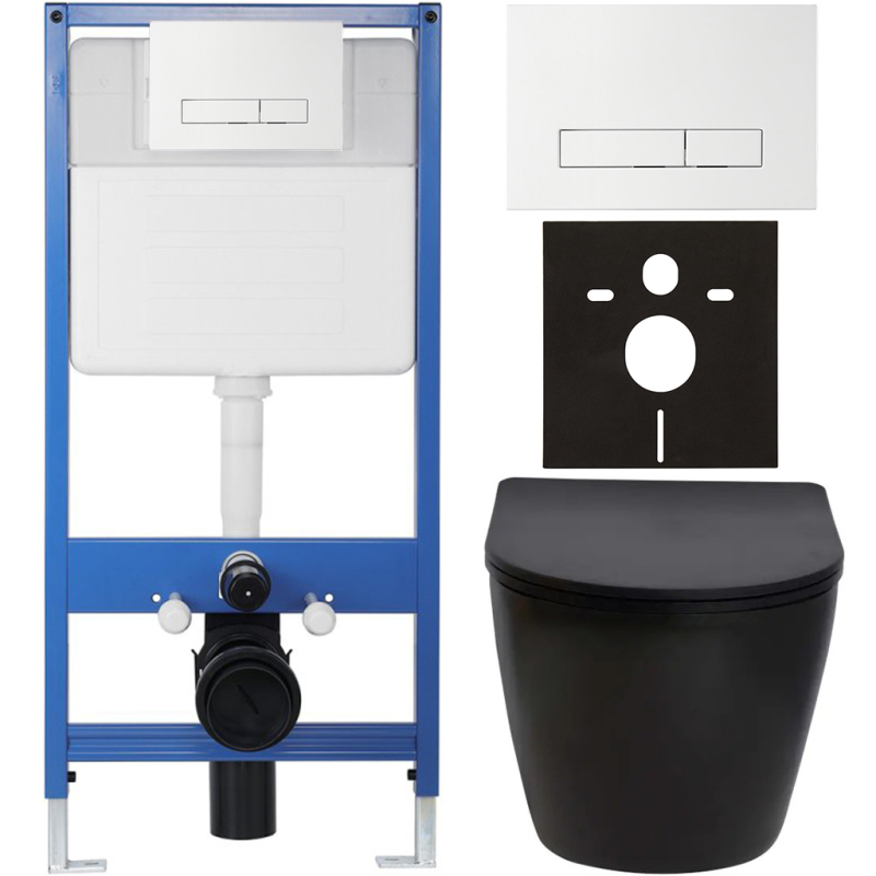 CERANO - Kompletní podomítkový WC set Lite/Verde - černá matná - WC tlačítko Slim, bílé - předstěnová instalace/sádrokarton - 49x36 cm