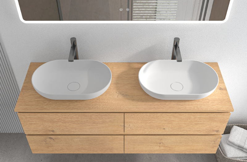Koupelnové desky jsou vyrobeny z MDF lamina (středně hustá dřevovláknitá deska) s nalisovanou melaminovou fólií, která je odolná vůči vlhkosti, poškrábání, UV záření a běžným čisticím prostředkům. Povrch je hladký, tvrdý, homogenní a snadno se čistí. MDF desky se nekroutí jako masivní dřevo. Pokud dojde k mechanickému narušení laminace, samotné MDF jádro může navlhnout.