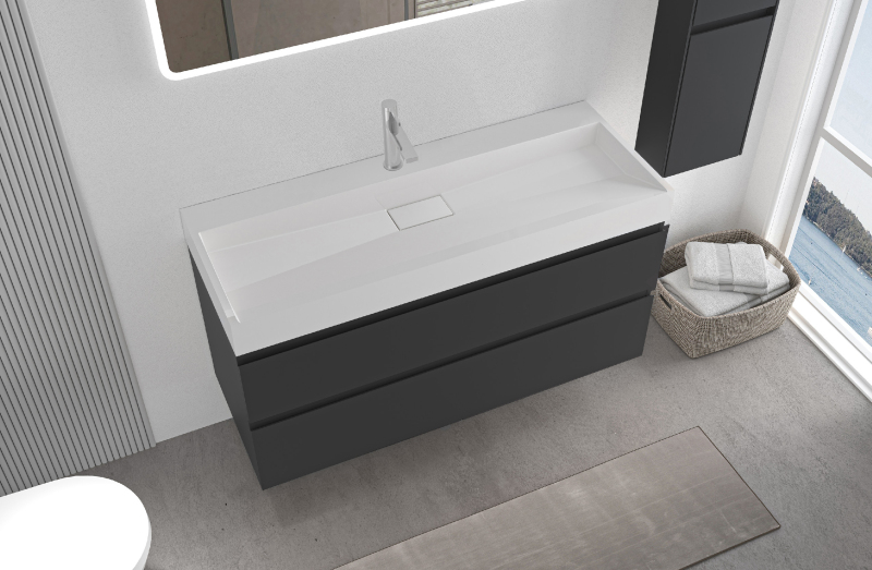 Koupelnové skříňky jsou vyrobeny z MDF lamina (středně hustá dřevovláknitá deska) s nalisovanou melaminovou fólií, která je odolná vůči vlhkosti, poškrábání, UV záření a běžným čisticím prostředkům. Povrch je hladký, tvrdý, homogenní a snadno se čistí. MDF desky se nekroutí jako masivní dřevo. Pokud dojde k mechanickému narušení laminace, samotné MDF jádro může navlhnout.