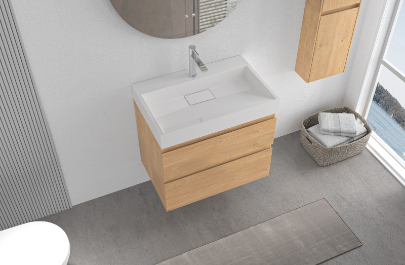 Koupelnové skříňky jsou vyrobeny z MDF lamina (středně hustá dřevovláknitá deska) s nalisovanou melaminovou fólií, která je odolná vůči vlhkosti, poškrábání, UV záření a běžným čisticím prostředkům. Povrch je hladký, tvrdý, homogenní a snadno se čistí. MDF desky se nekroutí jako masivní dřevo. Pokud dojde k mechanickému narušení laminace, samotné MDF jádro může navlhnout.