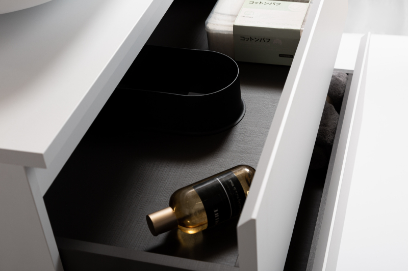 Koupelnové skříňky jsou vyrobeny z MDF lamina (středně hustá dřevovláknitá deska) s nalisovanou melaminovou fólií, která je odolná vůči vlhkosti, poškrábání, UV záření a běžným čisticím prostředkům. Povrch je hladký, tvrdý, homogenní a snadno se čistí. MDF desky se nekroutí jako masivní dřevo. Pokud dojde k mechanickému narušení laminace, samotné MDF jádro může navlhnout.