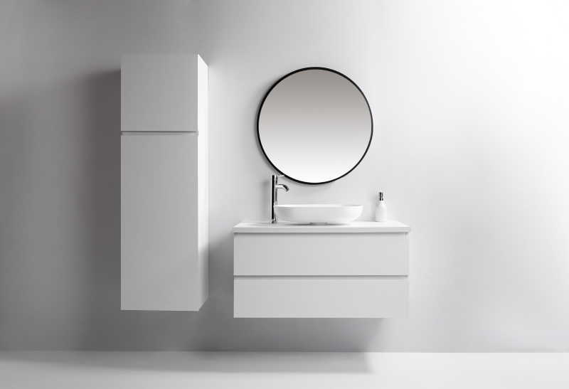 Koupelnové skříňky jsou vyrobeny z MDF lamina (středně hustá dřevovláknitá deska) s nalisovanou melaminovou fólií, která je odolná vůči vlhkosti, poškrábání, UV záření a běžným čisticím prostředkům. Povrch je hladký, tvrdý, homogenní a snadno se čistí. MDF desky se nekroutí jako masivní dřevo. Pokud dojde k mechanickému narušení laminace, samotné MDF jádro může navlhnout.