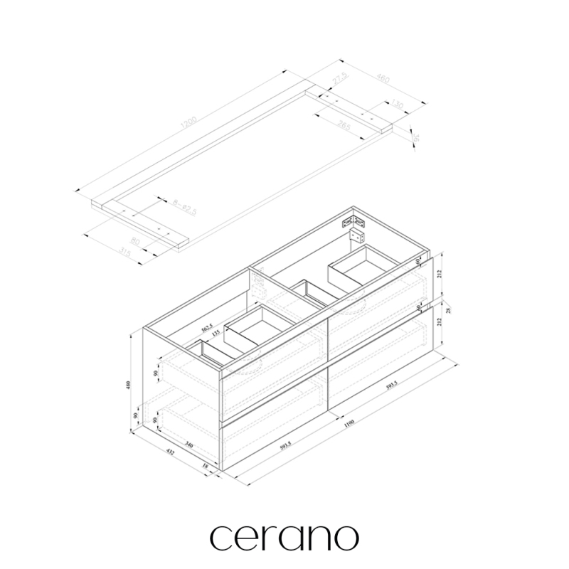 CERANO - Koupelnová skříňka Carole s deskou pod umyvadlo - 36 mm - bílá matná - 121x49,8x46,5 cm