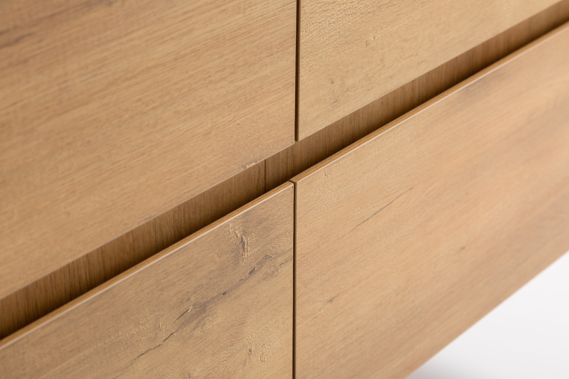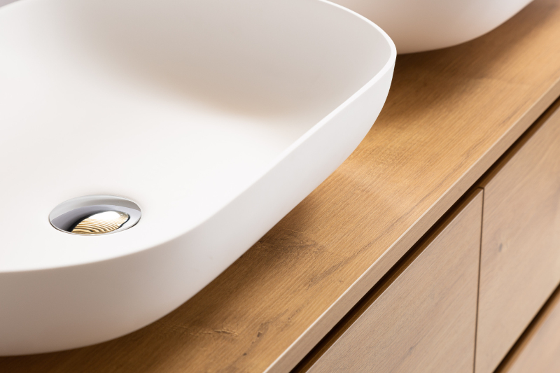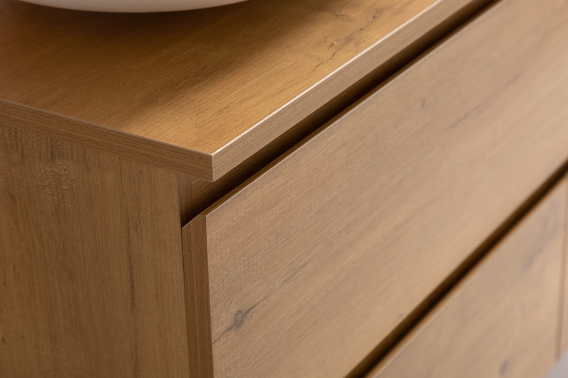 Koupelnové skříňky jsou vyrobeny z MDF lamina (středně hustá dřevovláknitá deska) s nalisovanou melaminovou fólií, která je odolná vůči vlhkosti, poškrábání, UV záření a běžným čisticím prostředkům. Povrch je hladký, tvrdý, homogenní a snadno se čistí. MDF desky se nekroutí jako masivní dřevo. Pokud dojde k mechanickému narušení laminace, samotné MDF jádro může navlhnout.