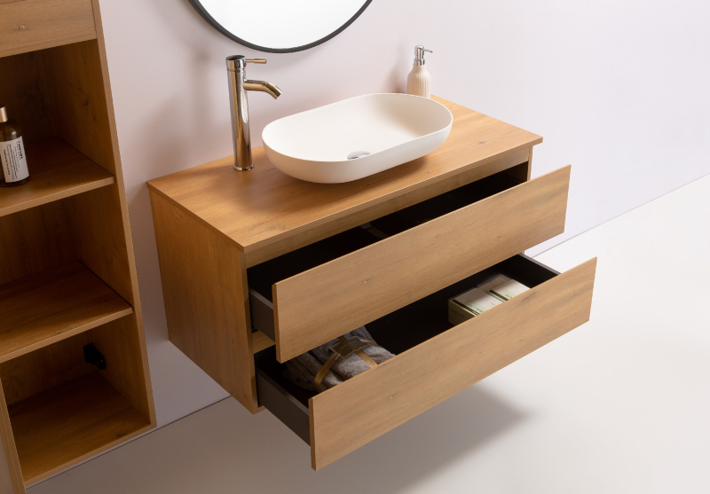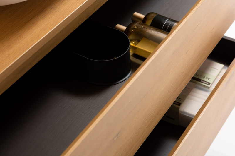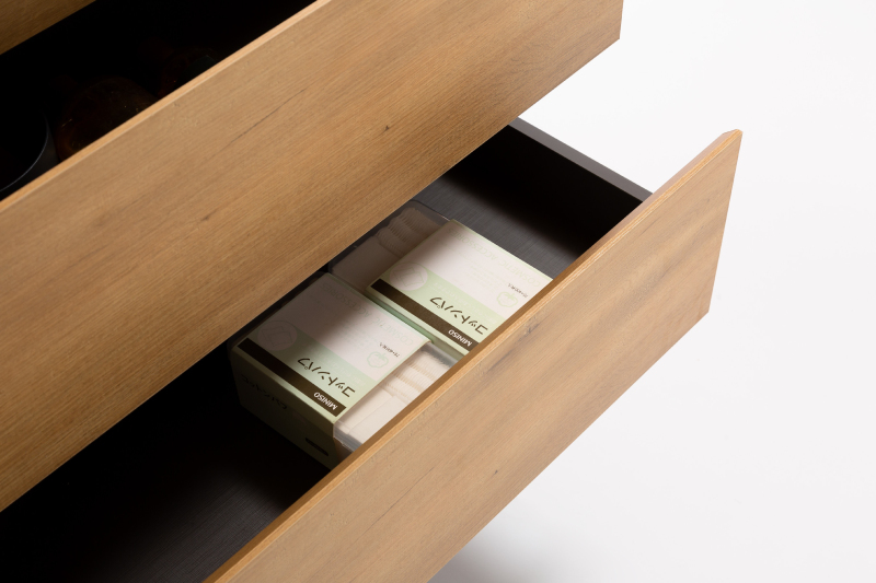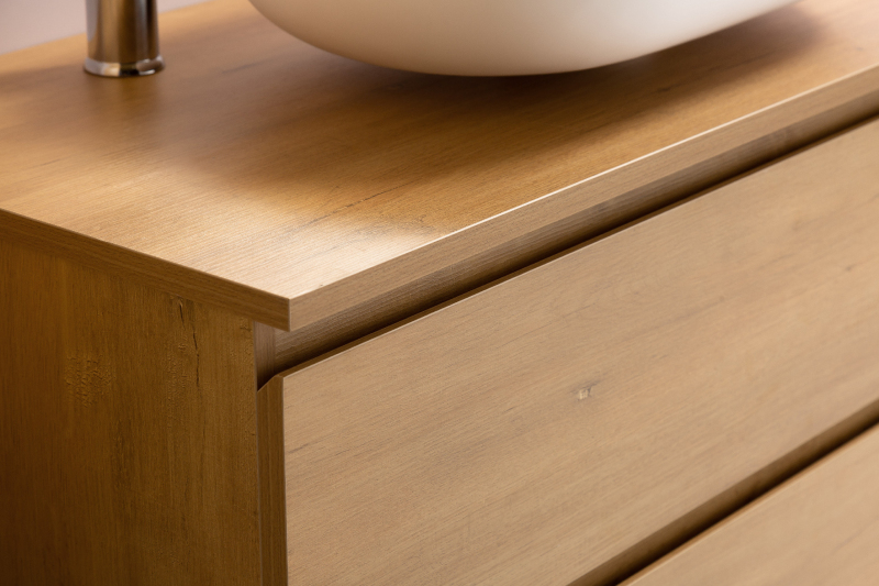 Koupelnové skříňky jsou vyrobeny z MDF lamina (středně hustá dřevovláknitá deska) s nalisovanou melaminovou fólií, která je odolná vůči vlhkosti, poškrábání, UV záření a běžným čisticím prostředkům. Povrch je hladký, tvrdý, homogenní a snadno se čistí. MDF desky se nekroutí jako masivní dřevo. Pokud dojde k mechanickému narušení laminace, samotné MDF jádro může navlhnout.