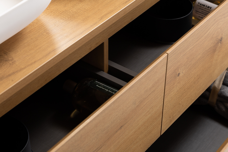 Koupelnové skříňky jsou vyrobeny z MDF lamina (středně hustá dřevovláknitá deska) s nalisovanou melaminovou fólií, která je odolná vůči vlhkosti, poškrábání, UV záření a běžným čisticím prostředkům. Povrch je hladký, tvrdý, homogenní a snadno se čistí. MDF desky se nekroutí jako masivní dřevo. Pokud dojde k mechanickému narušení laminace, samotné MDF jádro může navlhnout.