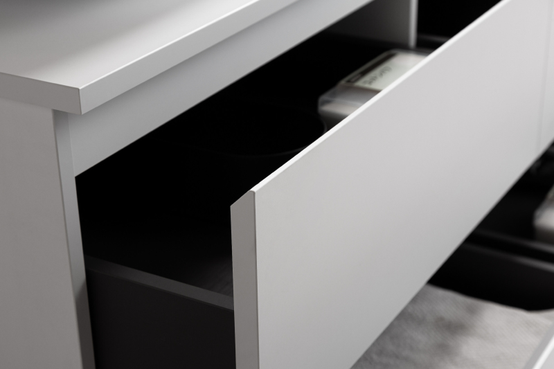 Zásuvka je osazena mechanismem soft-close, který kombinuje tlumicí jednotku a pružinový systém pro řízené dovírání. Při zavírání dochází k automatickému zpomalení pohybu a následnému tichému dotažení zásuvky do koncové polohy. Mechanismus zabraňuje nárazu, prodlužuje životnost zásuvky a zajišťuje vyšší uživatelský komfort.