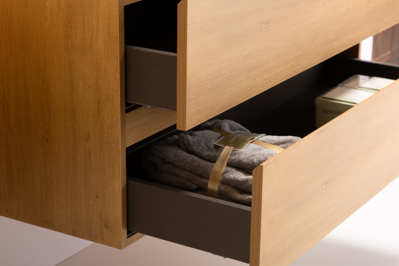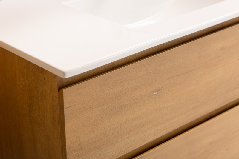 Koupelnové skříňky jsou vyrobeny z MDF lamina (středně hustá dřevovláknitá deska) s nalisovanou melaminovou fólií, která je odolná vůči vlhkosti, poškrábání, UV záření a běžným čisticím prostředkům. Povrch je hladký, tvrdý, homogenní a snadno se čistí. MDF desky se nekroutí jako masivní dřevo. Pokud dojde k mechanickému narušení laminace, samotné MDF jádro může navlhnout.