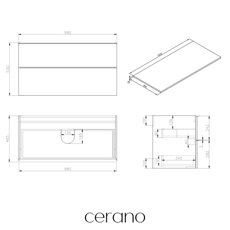 CERANO - Koupelnová skříňka pod umyvadlo s úchytkou/deskou pod umyvadlo Velora - 18 mm - černá matná, černá úchytka - 99x53x46 cm