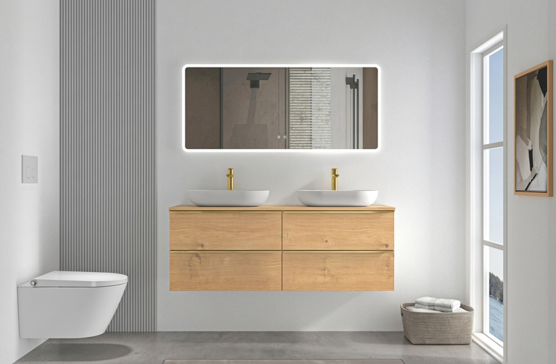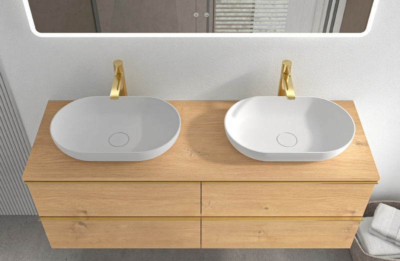 Koupelnové skříňky jsou vyrobeny z MDF lamina (středně hustá dřevovláknitá deska) s nalisovanou melaminovou fólií, která je odolná vůči vlhkosti, poškrábání, UV záření a běžným čisticím prostředkům. Povrch je hladký, tvrdý, homogenní a snadno se čistí. MDF desky se nekroutí jako masivní dřevo. Pokud dojde k mechanickému narušení laminace, samotné MDF jádro může navlhnout.