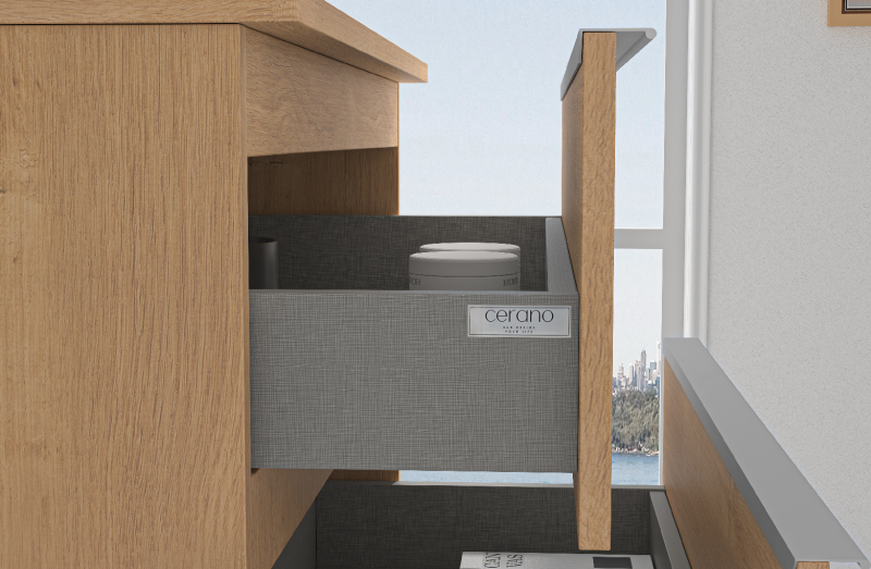 Zásuvka je osazena mechanismem soft-close, který kombinuje tlumicí jednotku a pružinový systém pro řízené dovírání. Při zavírání dochází k automatickému zpomalení pohybu a následnému tichému dotažení zásuvky do koncové polohy. Mechanismus zabraňuje nárazu, prodlužuje životnost zásuvky a zajišťuje vyšší uživatelský komfort.