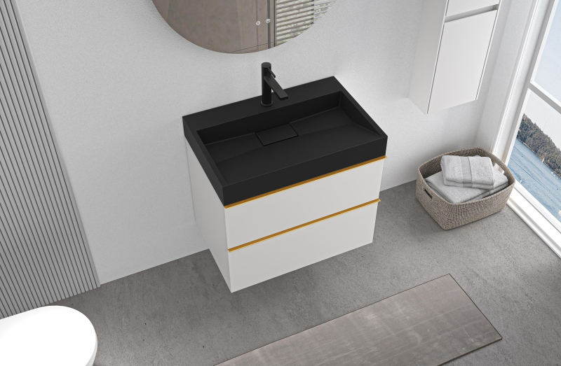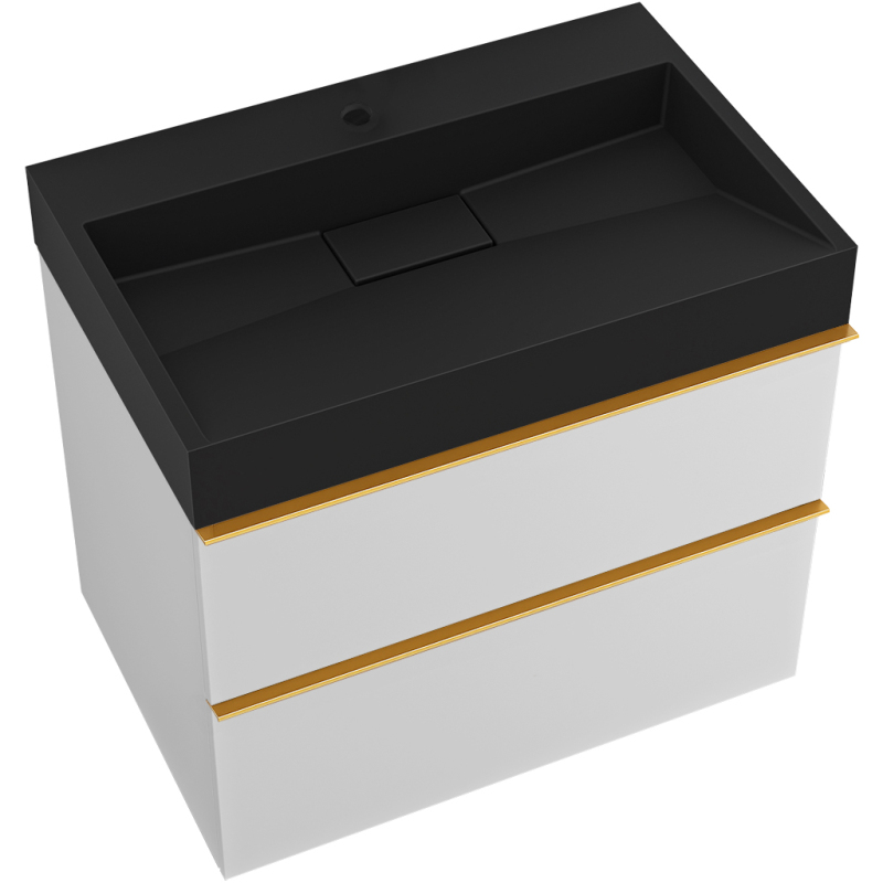 CERANO - Koupelnová skříňka Velora - bílá matná - úchytka zlatá + umyvadlo s otvorem pro baterii z litého mramoru Vita - černá - 69x49,8x46 cm