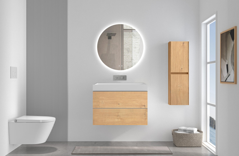 Koupelnové skříňky jsou vyrobeny z MDF lamina (středně hustá dřevovláknitá deska) s nalisovanou melaminovou fólií, která je odolná vůči vlhkosti, poškrábání, UV záření a běžným čisticím prostředkům. Povrch je hladký, tvrdý, homogenní a snadno se čistí. MDF desky se nekroutí jako masivní dřevo. Pokud dojde k mechanickému narušení laminace, samotné MDF jádro může navlhnout.
