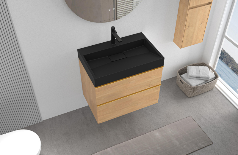 Koupelnové skříňky jsou vyrobeny z MDF lamina (středně hustá dřevovláknitá deska) s nalisovanou melaminovou fólií, která je odolná vůči vlhkosti, poškrábání, UV záření a běžným čisticím prostředkům. Povrch je hladký, tvrdý, homogenní a snadno se čistí. MDF desky se nekroutí jako masivní dřevo. Pokud dojde k mechanickému narušení laminace, samotné MDF jádro může navlhnout.