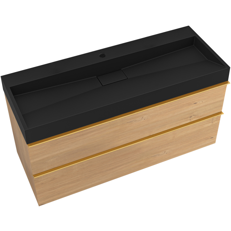 CERANO - Koupelnová skříňka Velora - dub medový - úchytka zlatá + umyvadlo s otvorem pro baterii z litého mramoru Vita - černá - 99x49,8x46 cm