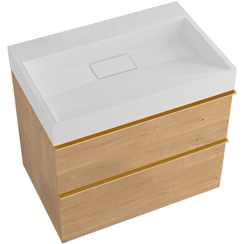 CERANO - Koupelnová skříňka Velora - dub medový - úchytka zlatá + umyvadlo z litého mramoru Vita - bílá lesklá - 69x49,8x46 cm