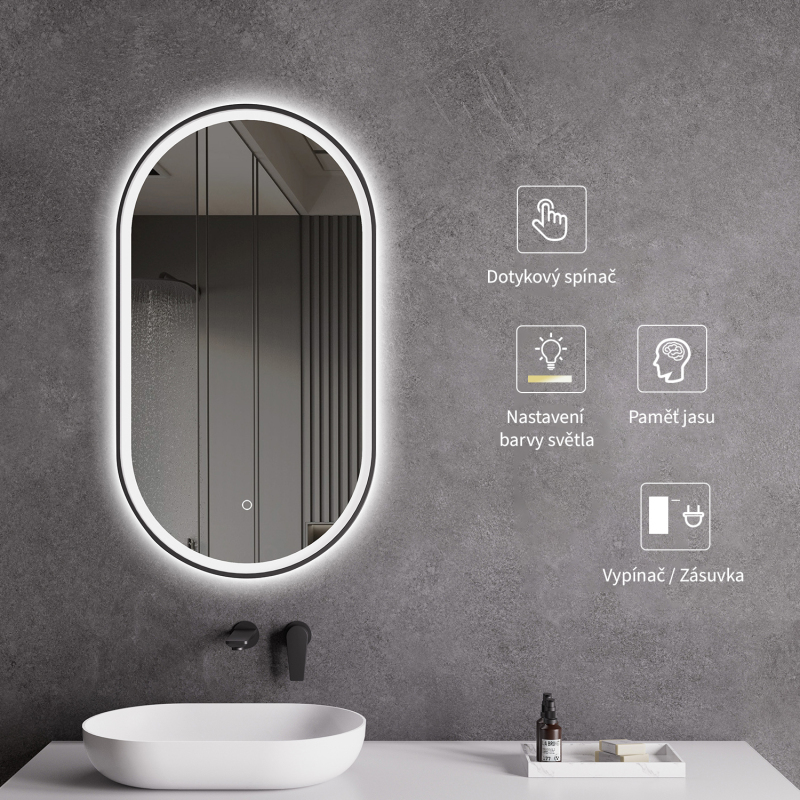 Zrcadlo je vybaveno LED osvětlením s nastavitelnou barvou světla – od 3000 K (teplá) do 6000 K (studená). Přepínání barev jednoduše ovládáte dotykovým tlačítkem na ploše zrcadla. Poskytuje intenzivní a jasné světlo pro detailní péči i příjemné, jemné osvětlení pro relaxaci. Díky širokému rozsahu teploty barev tak snadno přizpůsobíte atmosféru aktuální potřebě.