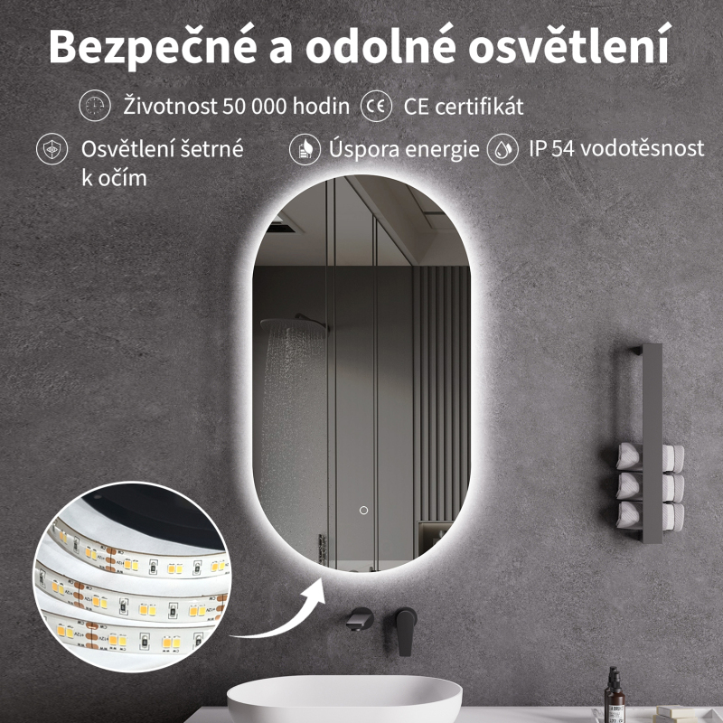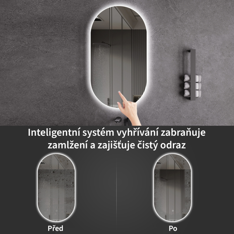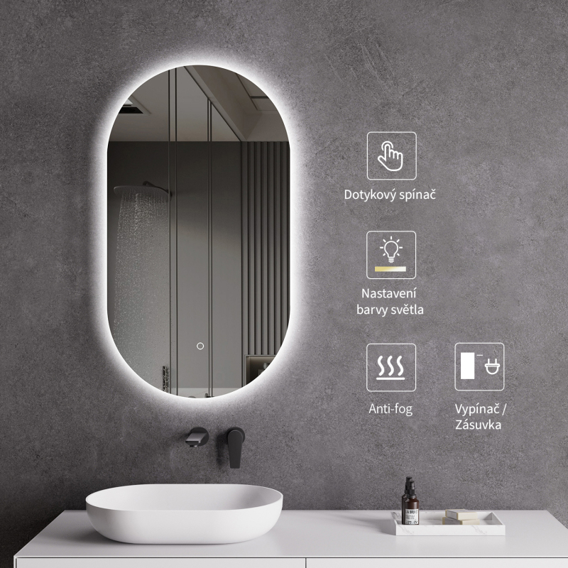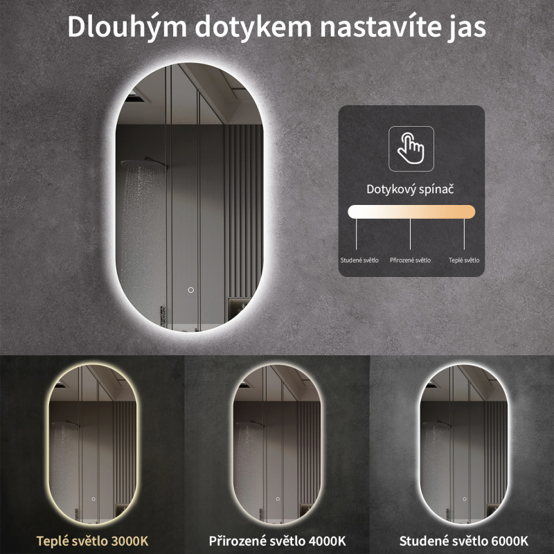 Zrcadlo je vybaveno LED osvětlením s nastavitelnou barvou světla – od 3000 K (teplá) do 6000 K (Neutrální). Přepínání barev jednoduše ovládáte dotykovým tlačítkem na ploše zrcadla. Poskytuje intenzivní a jasné světlo pro detailní péči i příjemné, jemné osvětlení pro relaxaci. Díky širokému rozsahu teploty barev tak snadno přizpůsobíte atmosféru aktuální potřebě.