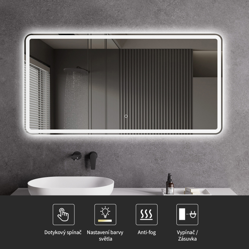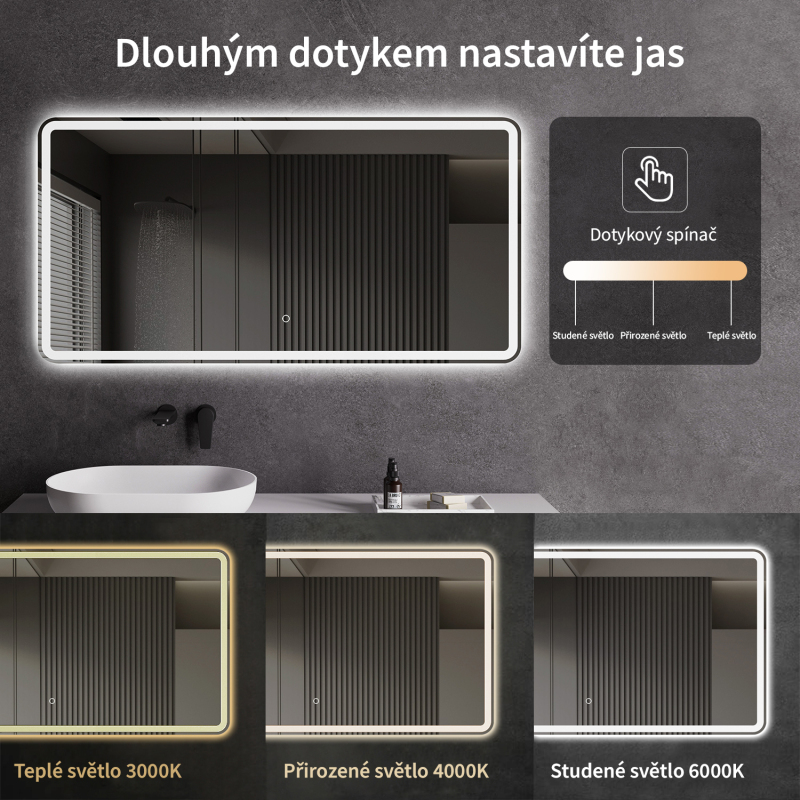 Zrcadlo je vybaveno LED osvětlením s nastavitelnou barvou světla – od 3000 K (teplá) do 6000 K (Neutrální). Přepínání barev jednoduše ovládáte dotykovým tlačítkem na ploše zrcadla. Poskytuje intenzivní a jasné světlo pro detailní péči i příjemné, jemné osvětlení pro relaxaci. Díky širokému rozsahu teploty barev tak snadno přizpůsobíte atmosféru aktuální potřebě.