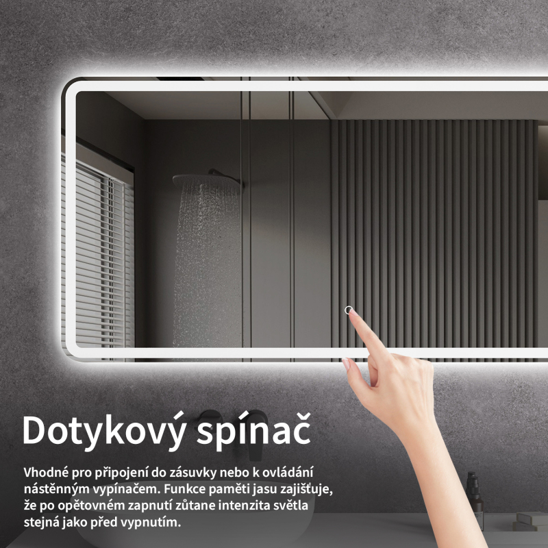 Osvětlení zrcadla lze snadno a pohodlně zapnout dotykem přepínače na panelu zrcadla. Umožňuje rychlé nastavení osvětlení bez nutnosti sahat po vzdálenějším tradičním vypínači.