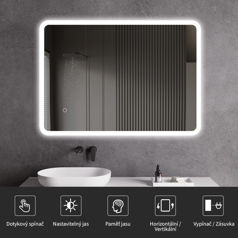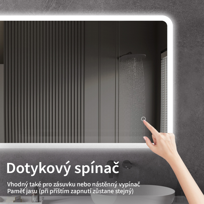Osvětlení zrcadla lze snadno a pohodlně zapnout dotykem přepínače na panelu zrcadla. Umožňuje rychlé nastavení osvětlení bez nutnosti sahat po vzdálenějším tradičním vypínači.