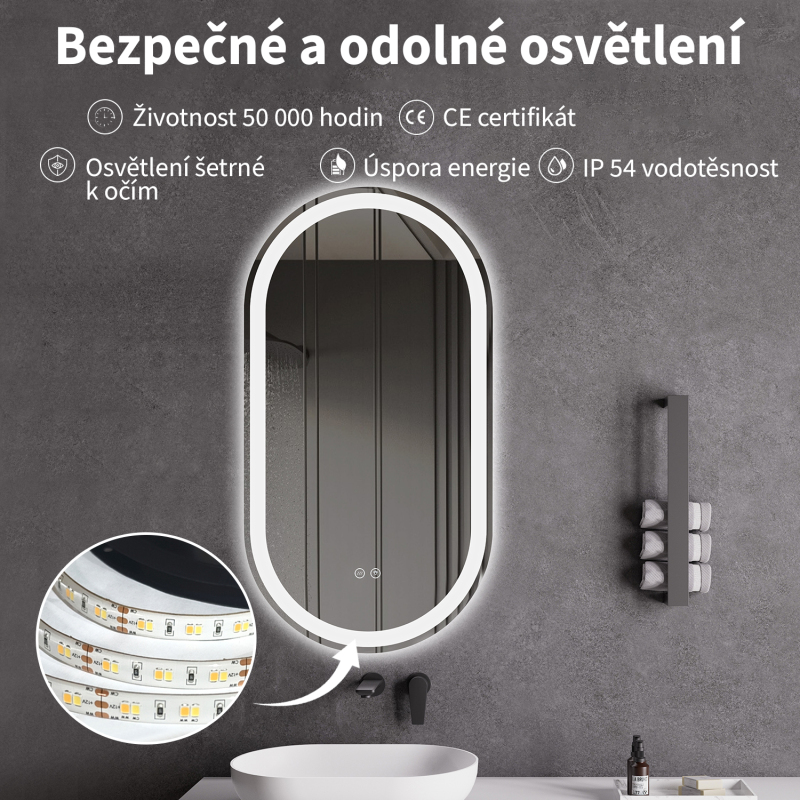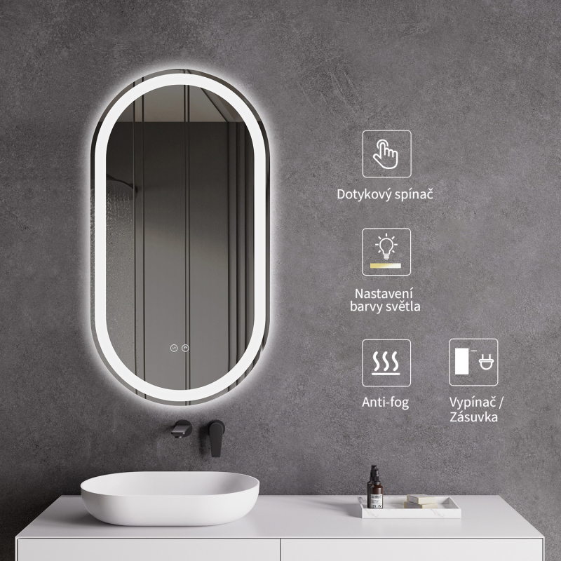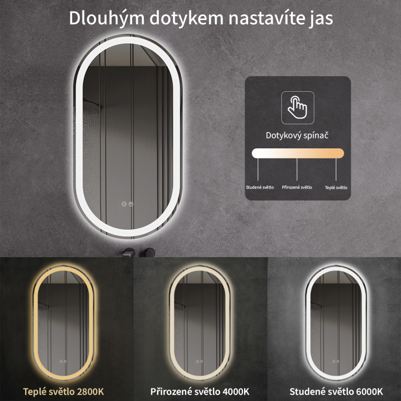 Zrcadlo je vybaveno LED osvětlením s nastavitelnou barvou světla – od 2800K (teplá) do 6000K (Neutrální). Poskytuje intenzivní a jasné osvětlení pro detailní péči i příjemné a jemné světlo pro relaxaci. Díky širokému rozsahu teploty barev lze přizpůsobit atmosféru dle potřeby.
